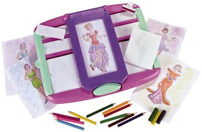 Children create fantastic outfits without being proficient at drawing. Simply choose from 12 dress, body, head, and texture templates to create unique combinations. Place the templates in the holder, and with included paper, 4 crayons, and crayon holder, rub the plates to create the silhouette of the model. Also comes with 10 colored pencils. Colors may vary. Size 13"l, Weight 2 lbs. Age 3+.